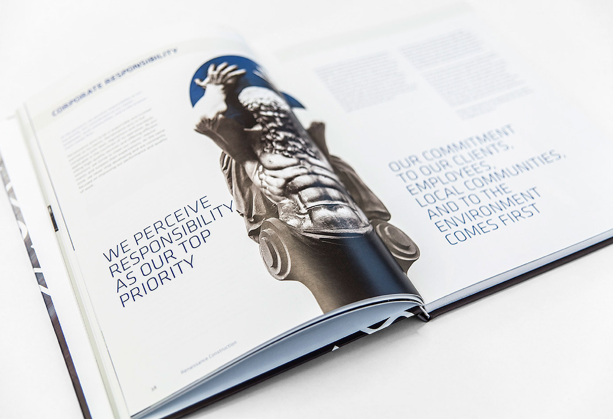 Renaissance Construction — is Russia's biggest foreign-origin construction company. Started as a small service firm, now the company implements national infrastructural objects and humanitarian facilities. Being a part of in-house design team, we created a smooth catalog that reflects the company’s vision and achievements.